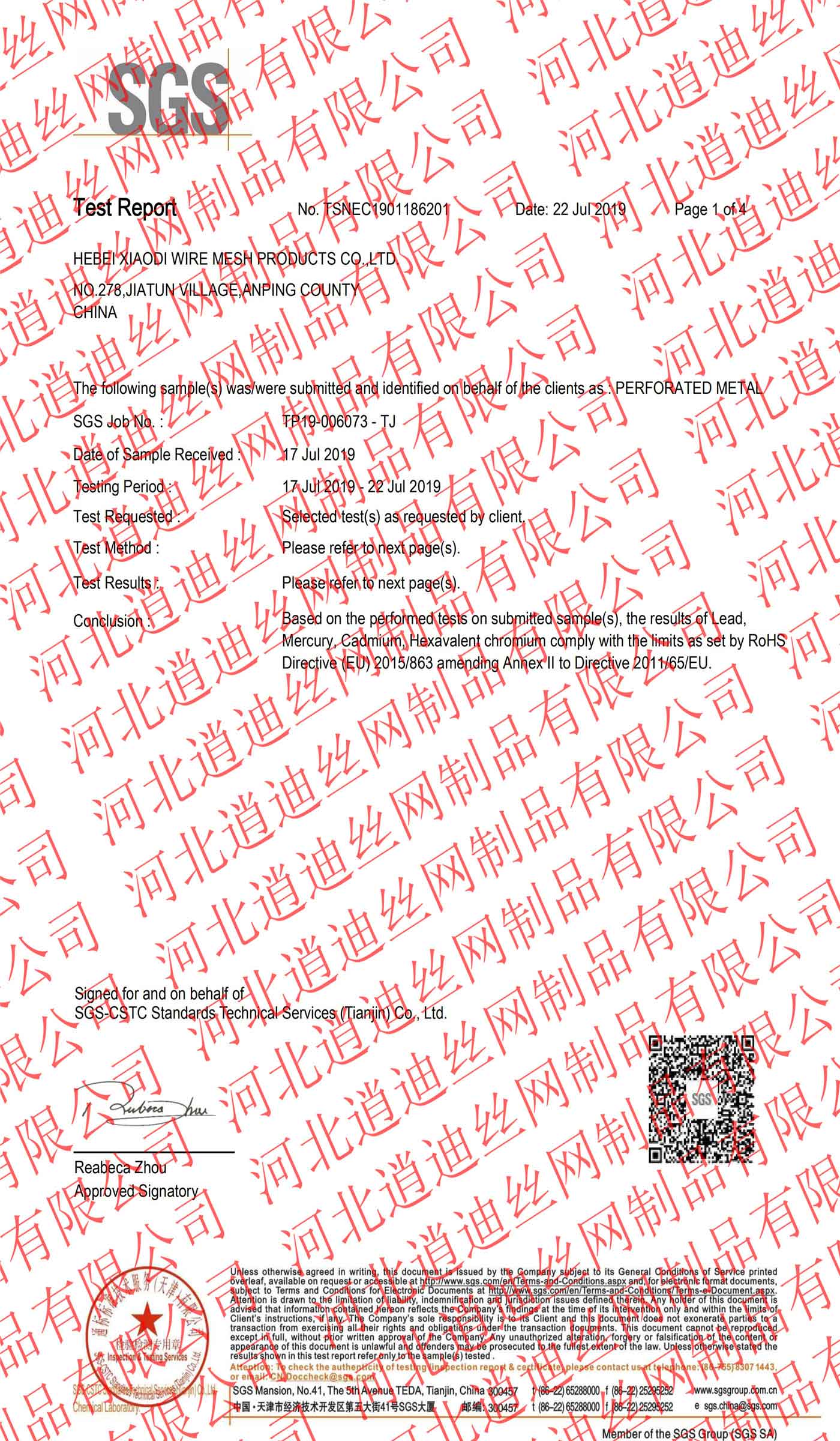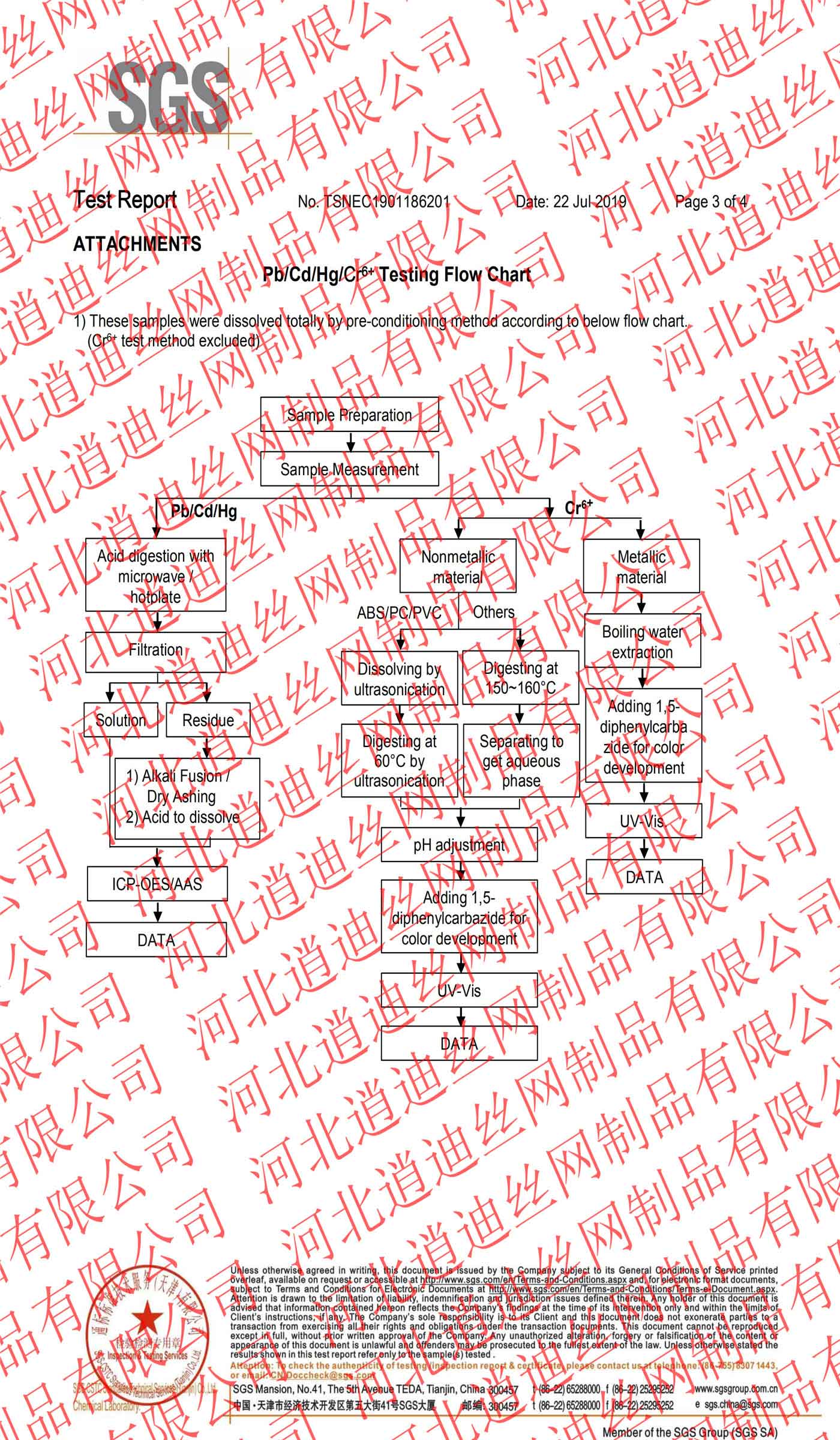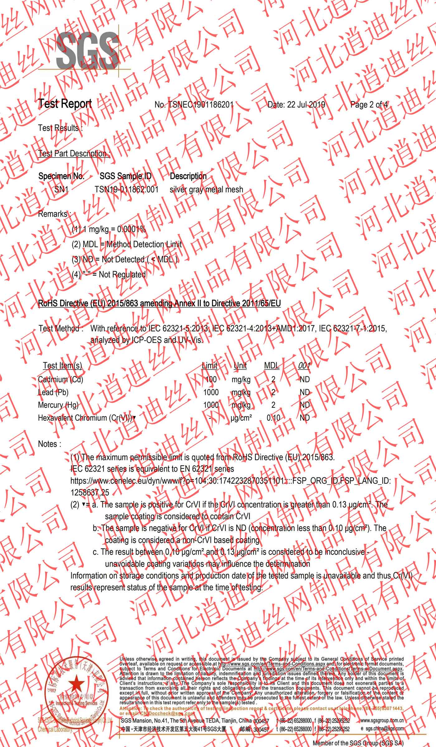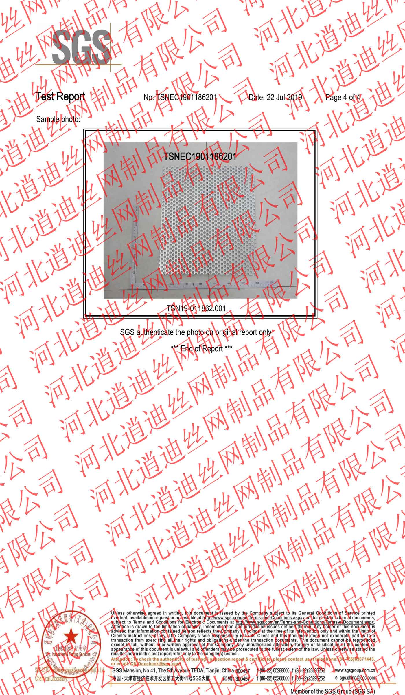 河北逍迪絲網(wǎng)制品有限公司2019年7月提交的SGS認(rèn)證有英文板有中文版有需要中文版的可以和廠家聯(lián)系樣品編號(hào)SN1SGS樣品IDTSN19-011862.001 NoTSNEC1901186202共計(jì)4頁(yè)